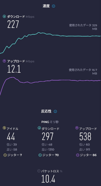 下り平均10~20Mが多い4Gに比べてとても速い。