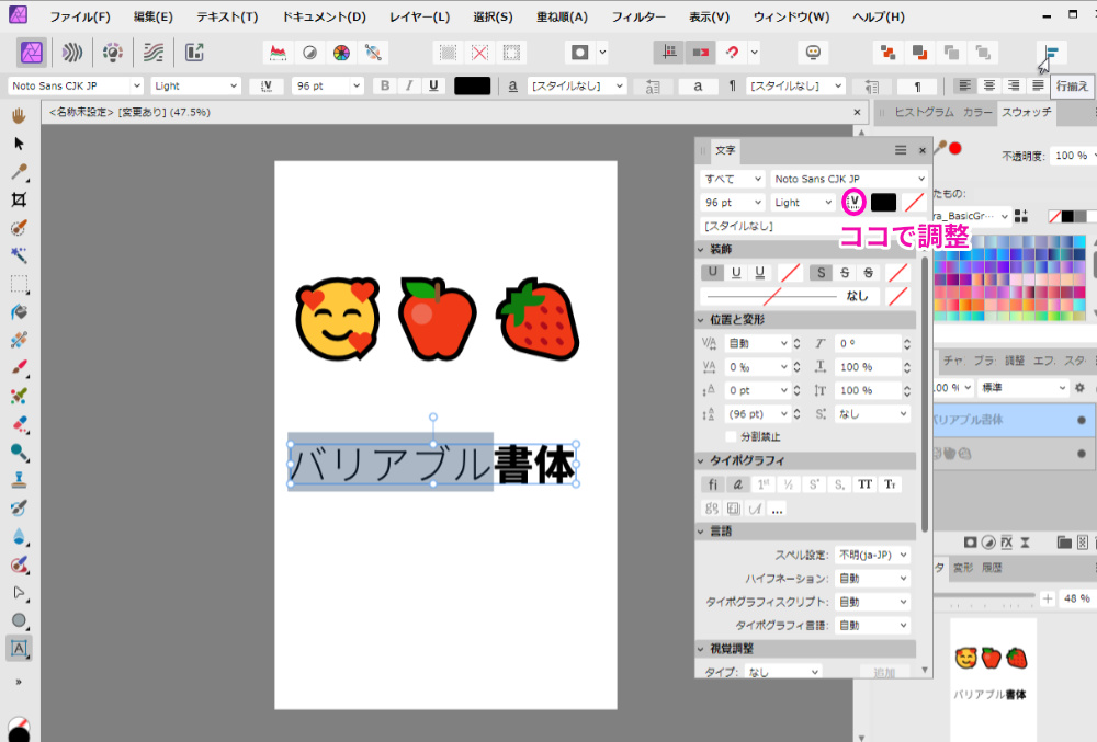 画像のサンプル画面では上の書体メニュー「V」からも太さなどを調整できる。